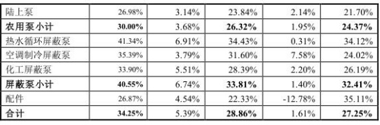 据招股书显示,2012-2016年,公司综合毛利率分别为25.03%、26.12%、27.25%、28.86%、34.25%。农用泵毛利率分别为23.44%、24.58%、24.37%、26.32%、30.00%。屏蔽泵毛利率分别为31.04%、29.83%、32.41%、33.81%、40.55%。