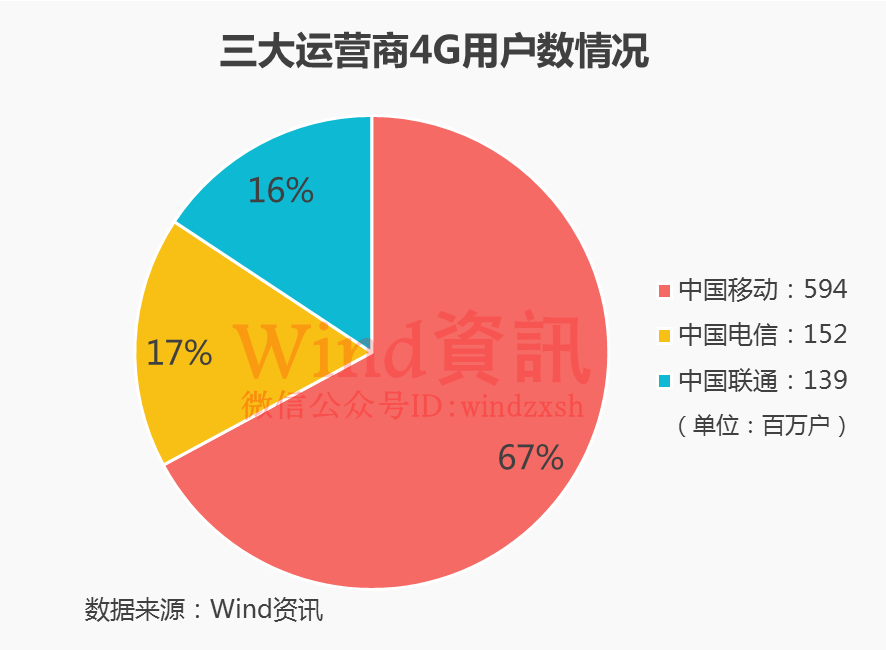 考虑到三大运营商已经基本上完成向4G的过渡,4G用户数量的多少也能够从侧面反映出各家的移动用户规模。最新数据统计显示,截止2017年6月,中国移动4G用户数为5.94亿,中国电信为1.52亿,中国联通为1.39亿。 中国移动稳居首位,中国联通和中国电信4G用户数基本相当。
