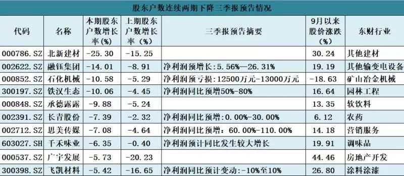 中国证券报(公众号:xhszzb)记者通过梳理近两期股东数连续下降幅度较大的上市公司发现,