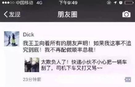 2016年4月17日,一向低调的王卫突然“高调”出现在大众视野,他的一条朋友圈截图在网上广为流传。当天,一位北京顺丰快递员在送货时不慎与一辆轿车发生剐蹭,被车主打了多个耳光。王卫在朋友圈转发了事件相关视频,并评论称:我王卫向着所有的朋友声明!如果这事不追究到底,我不再配做顺丰总裁!”