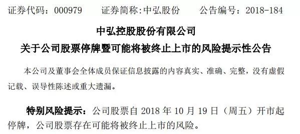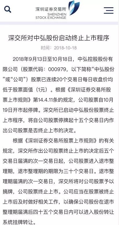 随后,深交所发布公告称,股票已连续20个交易日每日收盘价均低于股票面值(1元)。根据《深圳证券交易所股票上市规则》第14.4.11条的规定,公司股票自10月19日开市起停牌。深交所已启动中弘股份股票终止上市程序,将自公司股票停牌起十五个交易日内作出公司股票是否终止上市的决定。