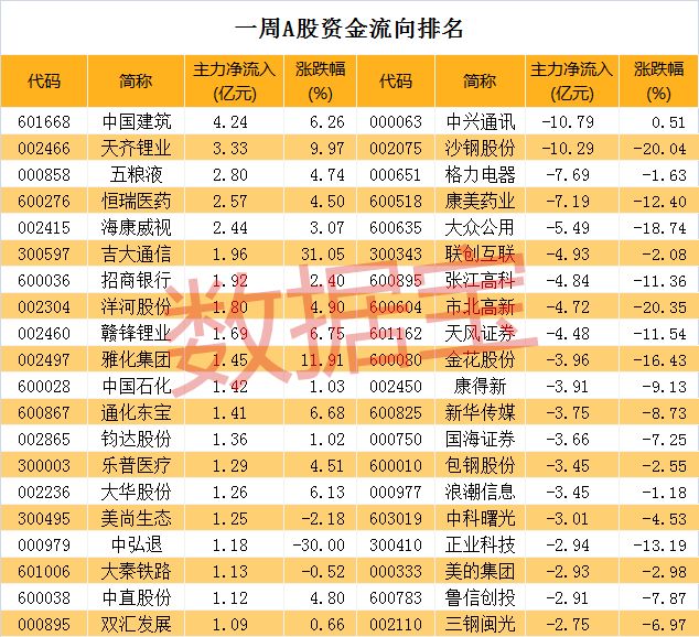 个股方面,本周22只个股主力资金净流入超亿元,较上周小幅增加。主力资金净流入最多的是中国建筑,主力资金净流入4.24亿元,本周股价上涨6.26%,日K线收出四连阳。天齐锂业、五粮液主力资金净流入分别为3.33、2.8亿元,股价累计涨幅分别为9.97%、4.74%。主力资金净流入较大的还有恒瑞医药、海康威视、吉大通信、招商银行、洋河股份等。