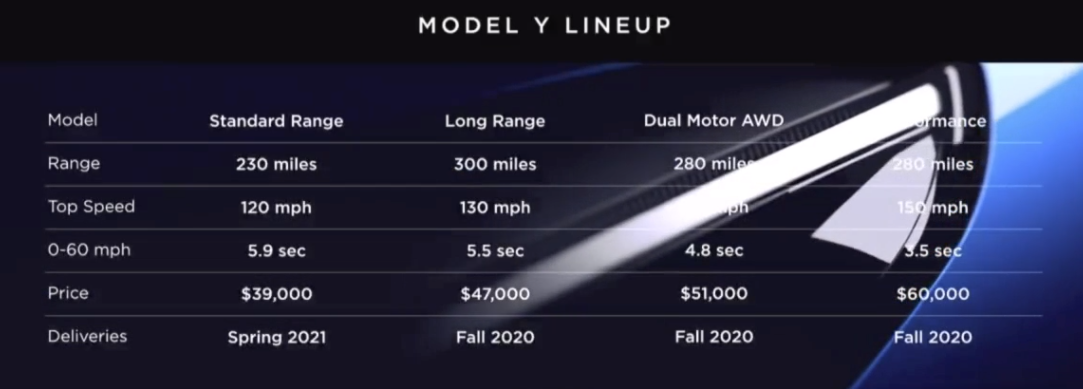 马斯克介绍称,Model Y为七座布局, 功能上像SUV,开起来像跑车。续航里程方面,标准版为230英里(约370公里),长续航版为300英里(约483公里)。Model Y标准版售价为3.9万美元(约26万元人民币),长续航版售价为 4.7万美元(约人民币31万元)。