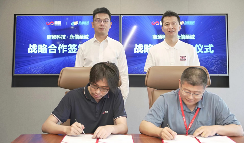 在商汤科技董事长兼CEO徐立、永信至诚董事长蔡晶晶的共同见证下,商汤科技联合创始人、大装置事业群副总裁陈宇恒和永信至诚CTO张凯代表双方签署战略合作协议。
