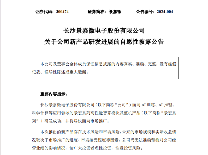 3月12日,景嘉微盘后公告,公司面向AI训练、AI推理、科学计算等应用领域的景宏系列高性能智算模块及整机产品(简称“景宏系列”)研发成功,并将尽快面向市场推广。