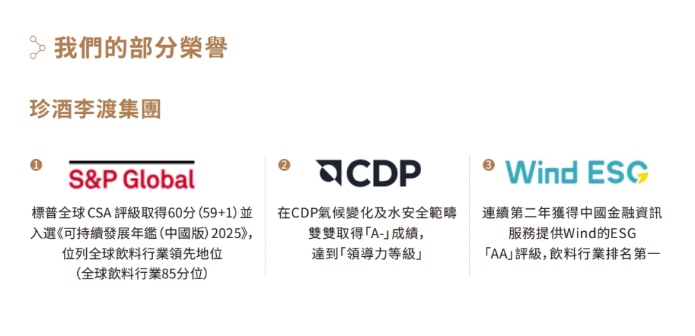 2024年,珍酒李渡首次参与标普CSA ESG评级,斩获60分佳绩,得分位列中国白酒行业第一,并成功入选标普《可持续发展年鉴(中国版)2025》;首次申报CDP(全球环境信息研究中心)评级,在气候变化和水安全领域获双“A-”成绩,领先国内食品饮料行业;持续保持万得ESG“AA”评级,并连续两年入选万得“中国上市公司ESG最佳实践100强”榜单,是白酒行业唯一上榜企业。