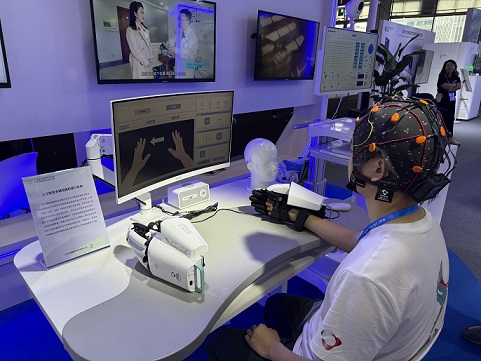 头戴“脑电帽”和“骨骼手套”,电脑便能捕捉人类大脑意念,然后控制外骨骼去执行,帮助患者进行神经康复训练——在上海术理智能展台,脑机接口技术正从实验室走向现实,参会观众纷纷驻足体验。