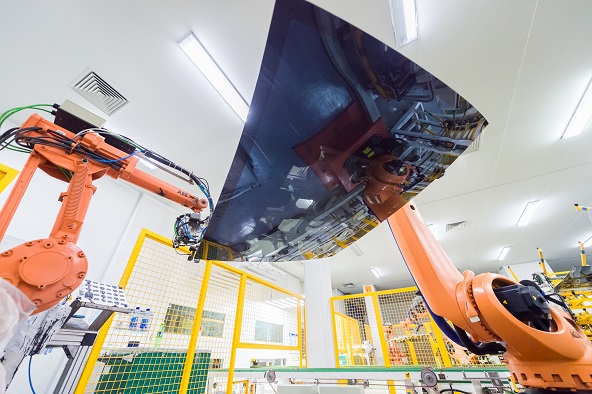 机械臂在福耀汽车玻璃智能工厂的车间生产玻璃产品 新华社图文