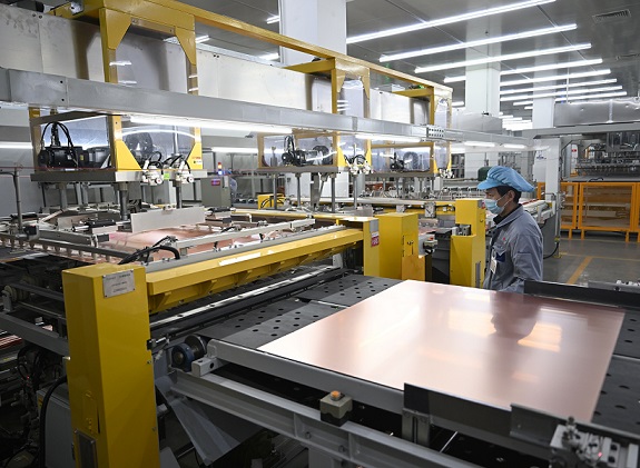 工人在一覆铜板生产车间进行裁切作业。 新华社图片
