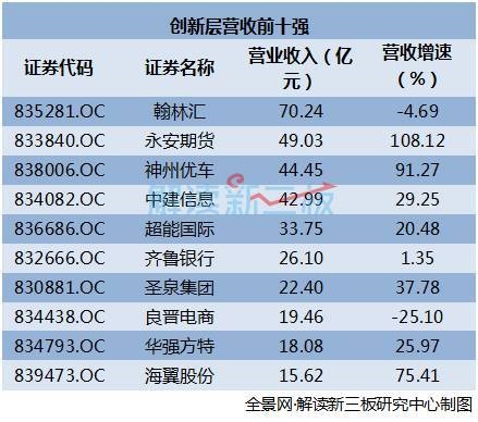 在创新层营收榜单前十名中,明星公司的身影很活跃。永安期货半年营收49.03亿元斩获第二名,神州优车以44.45亿元的营收额紧跟其后,圣泉集团位列第七,《熊出没》出品方华强方特排第九。