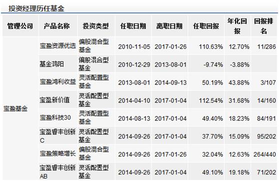 受到市场广泛关注的是,彭敢在管理宝盈资源优选等基金业绩突出。WIND资讯数据显示,以宝盈资源优选来看,他从2010年11月5日至2017年1月26日,任职回报达到110.63%,年化回报12.7%,回报在同类基金中也排名领先。