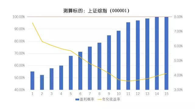 第四部分: 超过15年. 此时, 亏损变成一件非常困难的事情,但是年化收益率也开始断崖式下跌, 故我们不推荐这种操作。