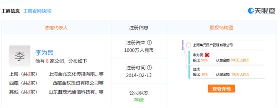 天眼查信息显示,上海集元资产成立于2014年2月13日,注册资本1000万人民币,目前公司拥有两位自然人股东,大股东李为民持有90%股权,另一个股东赵成持有剩下10%的股权。公司变更记录同时显示,大股东李为民是在2014年3月通过变更手续取得上述股权。