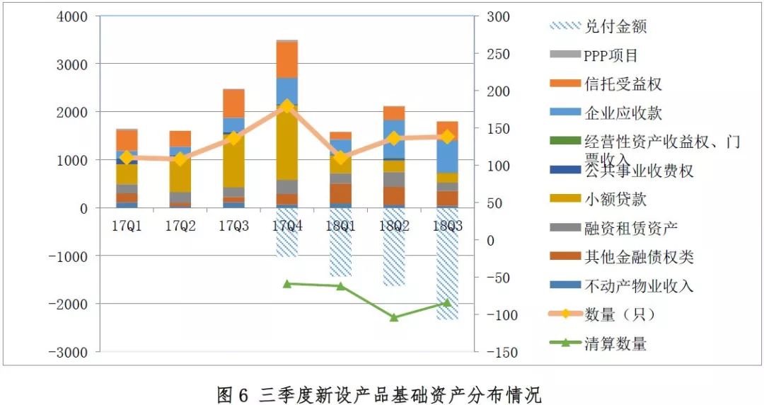 数据显示,三季度共有50家机构备案通过产品138只,产品数量同比增幅1.47%,总规模1797.87亿元,同比减幅27.37%,环比减幅15.20%。清算规模1652.11亿元,环比增长31.22%。三季度清算产品中,基础资产为小贷债权、企业应收款以及融资租赁债权的产品数量占比达81.00%。
