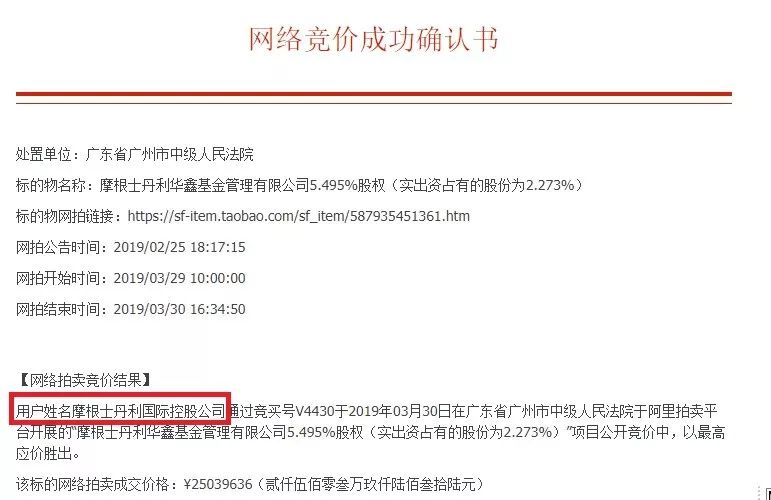 此次拍卖于今年3月29日开始,至3月30日结束,5.495%股权评估价格1441.37万元,起拍价格1008.96万元,竞拍公告同时显示,本次拍卖之中,大摩华鑫基金公司现有股东方——华鑫证券、摩根士丹利国际控股公司、深圳市招融投资控股公司、深圳市基石创业投资有限公司均享有优先购买权,深圳市基石创业投资有限公司要求行使优先购买权。