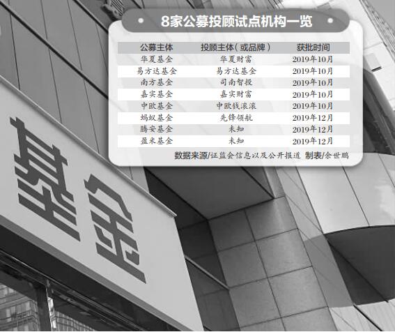 随后,嘉实基金、华夏基金、易方达基金、南方基金、中欧基金5家公募获得首批试点资格。包括本次获批的3家基金销售机构在内,目前共有8家机构具备了公募投顾业务资格。