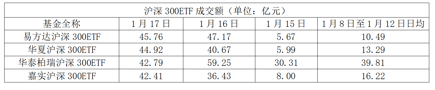 1月16日,沪深300ETF成交同样放量显著,业内人士认为,或因“大资金”出动。截至1月16日收盘,华泰柏瑞沪深300ETF、嘉实沪深300ETF、华夏沪深300ETF、易方达沪深300ETF成交额分别高达为59.25亿元、36.43亿元、40.67亿元和47.17亿元,远超此前成交额。