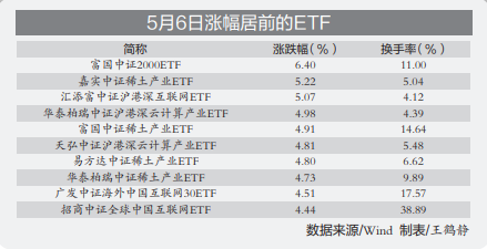 5月6日,A股三大指数集体涨超1%。算力、华为鸿蒙产业链等科技成长板块表现活跃,易方达中证海外互联ETF、华夏恒生互联网科技业ETF、富国中证港股通互联网ETF等多只百亿级别的ETF涨超3%。