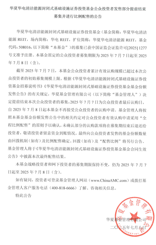 华夏华电清洁能源REIT原定的公众投资者募集期限为自2025年7月7日起至2025年7月8日(含)。截至2025年7月7日,该基金公众投资者累计有效认购规模已超过本次公众投资者的初始募集规模上限。根据基金招募说明书和基金份额发售公告的有关规定,华夏基金决定提前结束公众投资者的募集,2025年7月7日为公众投资者最后认购日,自2025年7月8日起该基金不再接受公众投资者的认购申请。