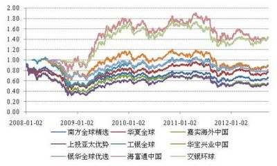 我们将2007、2008两年成立的9只产品分为QDII基金的第一代,2010年以后成立的为第二代。在第一代QDII基金中有2只是QDII-FOF型的,分别是南方全球精选配置和银华全球优选,其余7只都是股票型基金。从业绩上来看这一批基金的净值走势非常相似,除了海富通中国海外和交银环球精选的波动幅度略大,其余7只的净值走势基本保持同步。