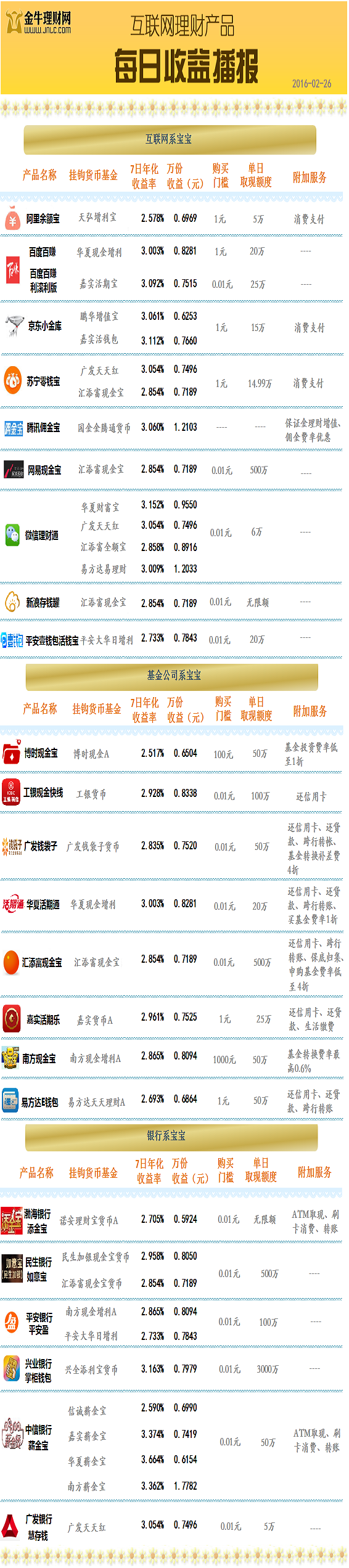 2月26日,金牛理财网统计的互联网系、银行系理财宝宝产品平均7日年化收益率均有所上涨,互联网系和银行系理财宝宝平均7日年化收益率分别涨至2.98%和3.03%。而基金公司系理财宝宝产品的平均7日年化收益率则下跌至2.83%。
