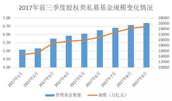 对于私募基金规模的狂飙,贡献最大的无疑是私募股权基金。截至2017年9月底,私募股权、创业投资基金管理人12352家,管理正在运作的基金26107只,管理基金规模6.48万亿元。