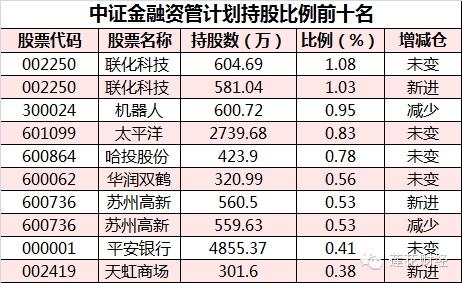 、招商证券(600999,买入)、安信信托(600816,买入)、湘电股份(600416,买入),持股比例分别为4.95%、3.48%、3.22%、3.17%、3.06%。资管计划持股比例相对较小,大部分在1%左右,如联化科技(002250,买入)持股1.08%,机器人(300024,买入)持股0.95%。