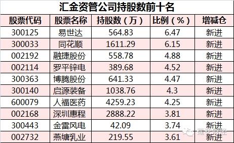 而汇金资管公司则出现在100家公司股东名单且持股比例也比较多。汇金资管持股较大的个股分别为易世达(300125,买入)、同花顺(300033,买入)、融捷股份(002192,买入)、罗平锌电(002114,买入)、腾博股份,持股比例分别为6.47%、6.15%、4.88%、4.52%、4.47%。