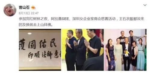 王石近期有两大动态:第一个是8月13日“曹山石”发微博称,王石在深圳某寺庙拜佛。