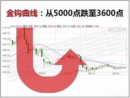 所谓“金钩曲线”就是指市场走势“左高右底”,类似中国传统的如意金钩,故名为“金钩曲线”,如下图所示,去年上证指数从5000点下跌至年底的3600点,就是一条典型的“金钩曲线”: