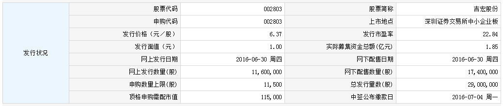 (记者 吴悦萌)厦门吉宏包装科技股份有限公司人民币普通股股票将于6月30日(周四)在深圳证券交易所中小板发行。股票简称“吉宏股份”,申购代码“002803”,发行价6.37元/股,市盈率22.84倍,行业市盈率35.3倍,申购上限1.15万股,顶格申购需市值11.5万元,中签缴款日为7月4日(周一)。