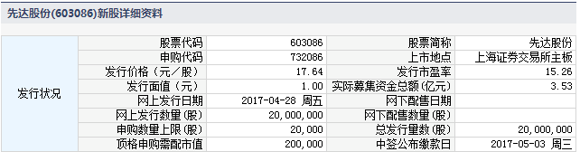 根据交易所公告,山东先达农化股份有限公司于2017年4月28日进行网上申购。本次发行股份数量为2,000万股,全部为发行人公开发行新股。网上发行数量为2,000万股,为本次发行数量的100%。