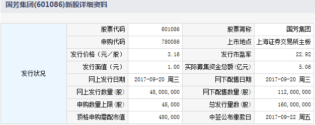 根据交易所公告,甘肃国芳工贸(集团)股份有限公司于2017年9月20日进行网上和网下申购。本次发行股份数量为16,000万股。本次发行全部为新股,不进行老股转让。回拨机制启动前,网下初始发行量为11,200万股,占本次发行总量的70%;网上初始发行数量为4,800万股,占本次发行总量的30%。
