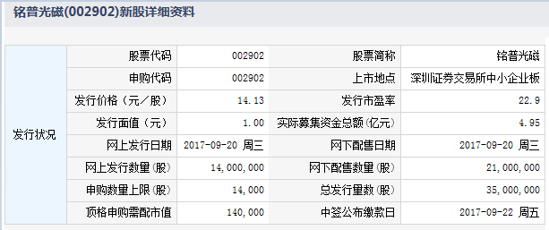根据交易所公告,东莞铭普光磁股份有限公司于2017年9月20日进行网上和网下申购。本次发行股份数量为3,500 万股,全部为新股,回拨机制启动前,网下初始发行数量为2,100 万股,为本次发行数量的60%;网上初始发行数量为1,400 万股,为本次发行数量的40%。