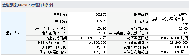 金逸影视9月28日发行 申购上限1.65万股
