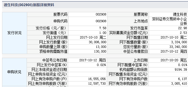 根据交易所公告,广东德生科技股份有限公司于2017年10月20日起在深圳证券交易所中小企业板上市交易。