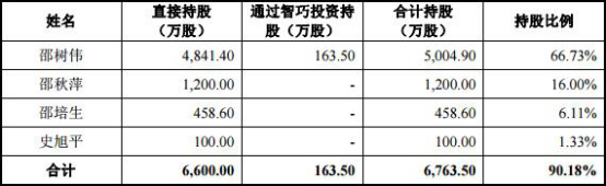 上述四人合计持股6,763.50万股,持股比例为90.18%(发行前)。其中,邵树伟持股5,004.90万股,持股比例为66.73%;邵秋萍持股1,200.00万股,持股比例为16.00%;邵培生持股458.60万股,持股比例为6.11%;史旭平持股100.00万股,持股比例为1.33%。