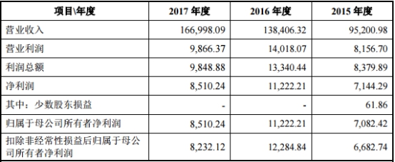 利通电子2015年至2017年实现营业收入分别为95,200.98万元、38,406.32万元、166,998.09万元;实现归属于母公司所有者净利润分别为7,082.42万元、11,222.21万元、8,510.24万元。其中,2017年的净利润同比下跌24.17%。