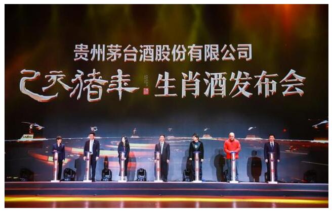 17时,随着7位领导嘉宾启动7个生肖转盘,最后在舞台上变幻投影出茅台股份4个品牌8款产品的3D酒瓶,茅台股份(己亥猪年)生肖酒宣告正式上市。
