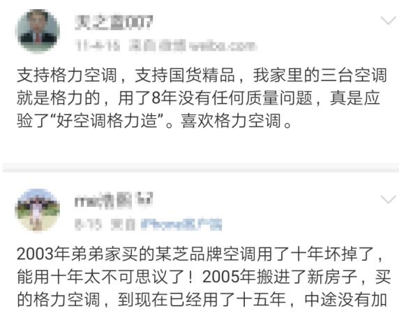 震惊之余,我继续从使用者反映看产品质量,浏览了微博上关于格力产品的评价,发现不少网友反馈,格力空调使用了10年,依旧能够正常制冷制热,故障率也极低。