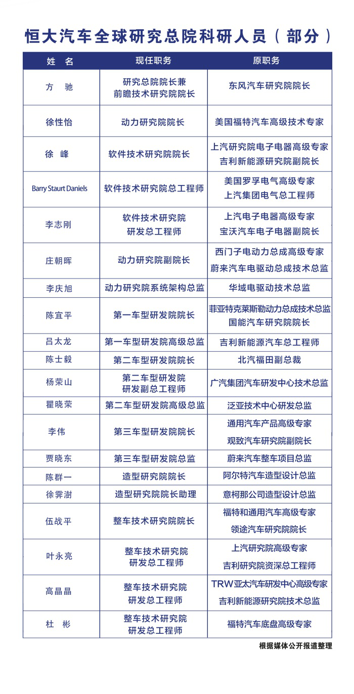 恒大还招兵买马,挖来一众汽车大咖助阵,如曾任东风汽车研究院院长的方驰,曾任美国福特汽车高级技术专家的徐性怡,原阿尔特汽车设计总监陈群一,都属业界大拿。