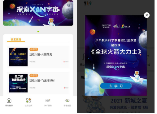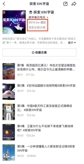 除了以上课程以外,新城控股还联合新华每日电讯抖音平台开启抖音话题#探索XIN宇宙#,集合航天相关的前沿资讯、以及航天知识科普短视频,让小业主们将课堂上的知识与时事相结合,持续激发其探索航天的的热情。该话题共更新20集,话题在平台的总播放量已突破6500万。