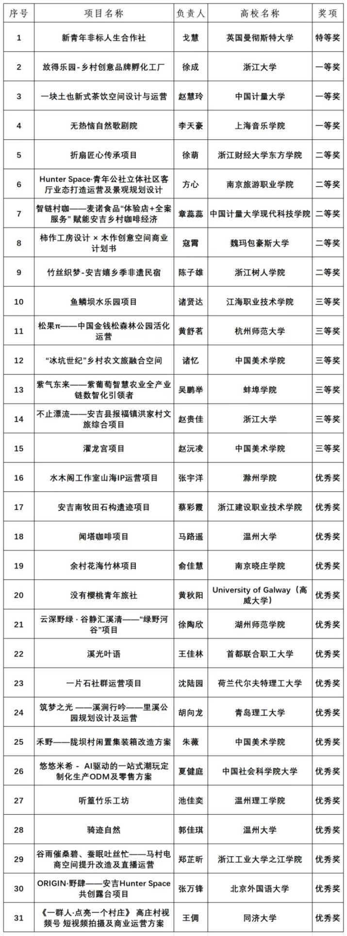 图为第三届“两山杯”全国大学生乡村振兴创新创意创业大赛创业赛道获奖名单