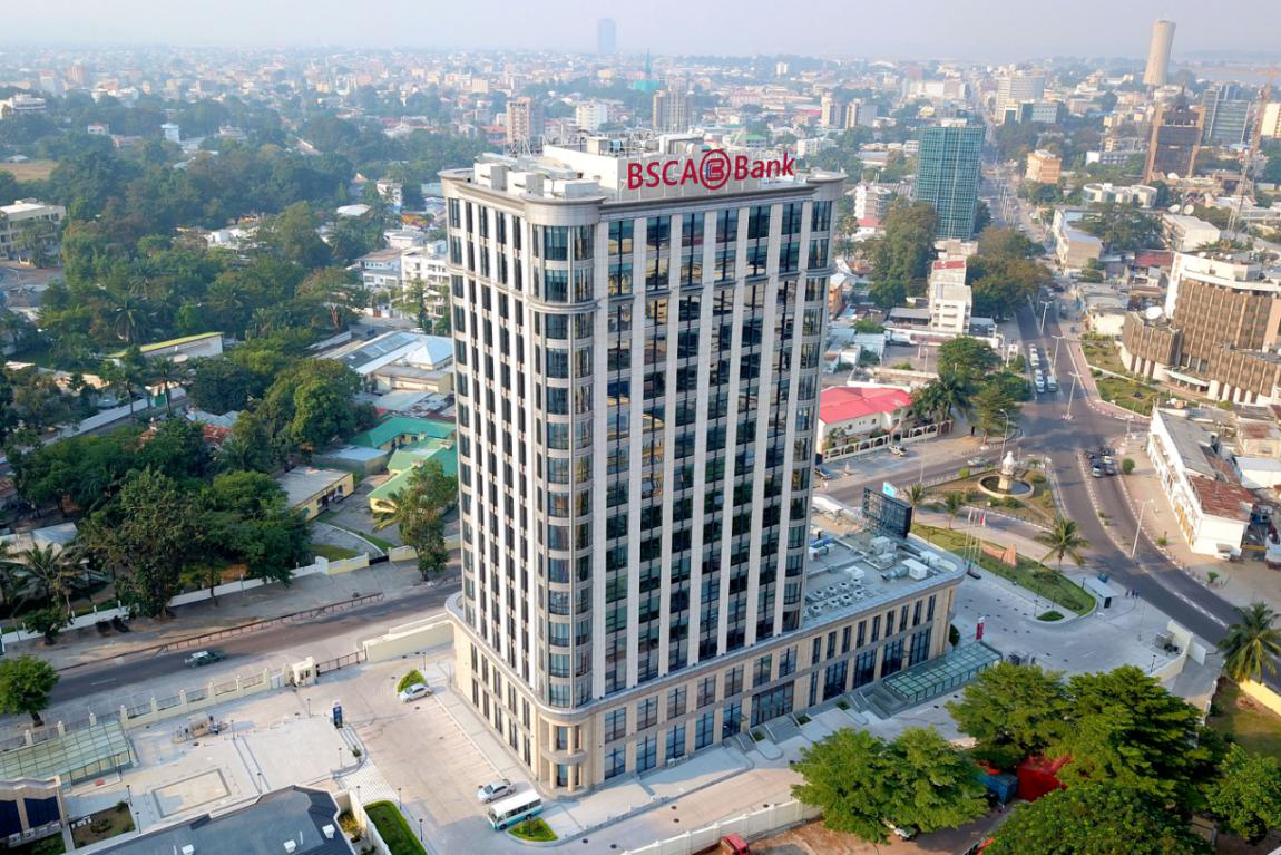 图为坐落于刚果(布)首都布拉柴维尔的中刚非洲银行办公大楼(航拍照片)