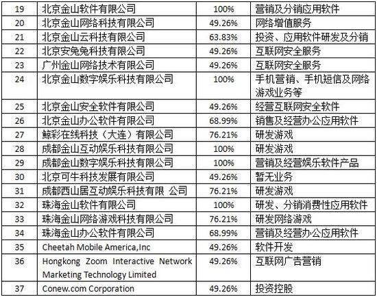金山软件的股东情况如下:(1)金山软件(证券代码:03888)1998年在开曼群岛注册成立,2007 年10月9日在香港联交所发行股票并上市交易,主营业务为投资控股。(2)珠海君天于2000年在珠海市注册成立,经多次股权转让后,于2009年12月由猎豹科技受让全部股权,珠海君天成为猎豹科技全资子公司,主要从事系统软件的开发和销售。(3)北京猎豹(原名为贝壳网际)2009年成立,经营范围为技术推广、技术开发、技术服务、技术咨询等;第二类增值电信业务中的信息服务业务。2011年,被金山安全协议控制。(4)猎豹移动2009年由金山软件在开曼群岛全资设立,2014 年5月8日在美国纳斯达克上市交易,经营范围为投资控股。金山软件持有猎豹移动49.26%的股份,腾讯控股持有16.5%,其余均为小股东。(5)猎豹科技(原名为金山安全软件有限公司)在香港注册成立,由猎豹移动全资成立,经营范围为投资控股、互联网广告服务推广,互联网游戏发布服务。(6)金山安全2009年由珠海君天全资成立,经营范围为技术推广、技术开发、技术服务、技术咨询等。(7)易魔秀为魔秀科技的员工持股平台,2015 年由魔秀科技 13 名员工根据中国合伙企业法共同出资成立,经营范围为软件技术开发、技术服务。