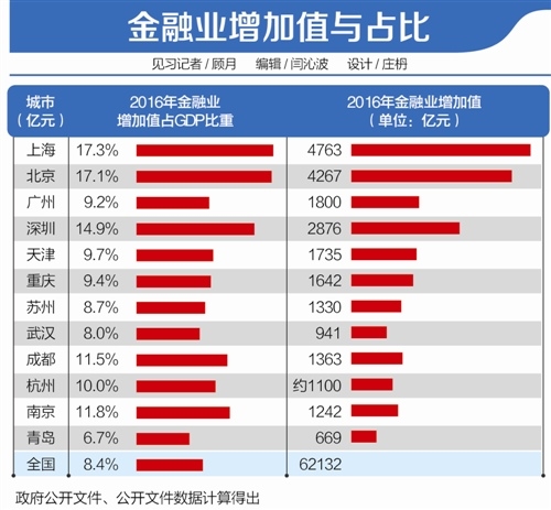 2016年上海再次以17.3%的金融业增加值占GDP比,及17.5%的增速位居各“万亿”级城市首位。