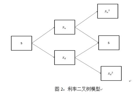 将所要构建利率二叉树的期限分成几个时间区间,每个长度为?t,每个时间段里,利率S有可能从最初变成新利率S_d或者S_u,u>1,S<1,S到S_u为利率上涨,S到S_d为利率下跌。