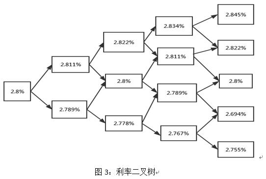 南京城建污水处理收费资产支持收益专项资产项目预期收益2.8%,选取同期国债收益率的平均利率r=3.157%,利率波动率按照经验值设为0.4%,即σ=0.4%,根据u=e^(σ√?t),得到u为1.004,d为0.996。将存续期分为4个时间段,每个时间段为1年,由此来计算利率二叉树,如图3所示。