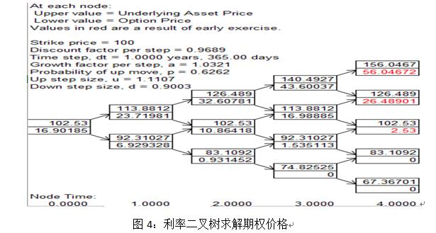 各参数的推倒值为:u=e^(σ√?t),d=e^(-σ√?t),σ为利率波动率。在起始点利率为S,在时刻?t,利率有两种可能:S_d、S_u,在2?t时段,利率有三种可能性:〖S_d〗^2、S、〖S_u〗^2,以此类推,在i?t时刻,利率有i+1种可能:Su^j d^(i-j),j=0,1…,i。二叉树结构,如下图2: