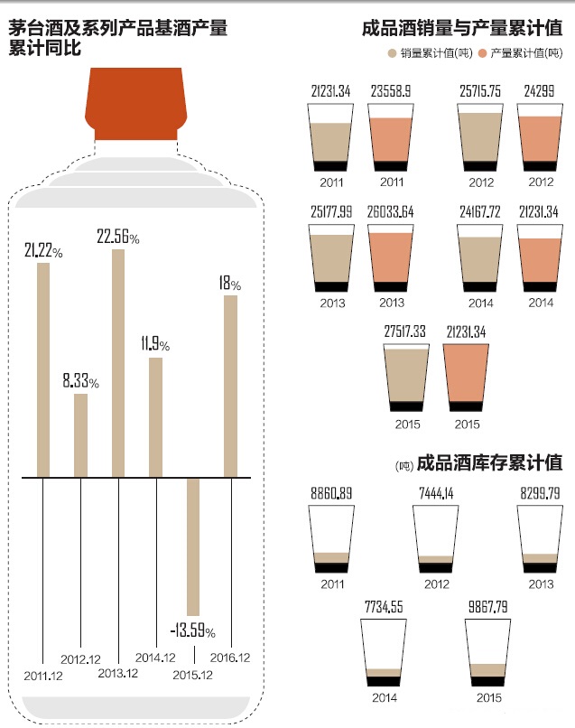 从总量上来看,除了2016年贵州茅台销量突然增长34%,其他年份总体保持稳定,2013年、2014年甚至出现连续下滑。